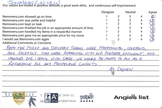“Both the pickup and delivery teams were professional, courteous, and friendly. They were respectful with our property, efficient, and handled our items with care. We would be happy to act as a reference for any prospective clients!”
