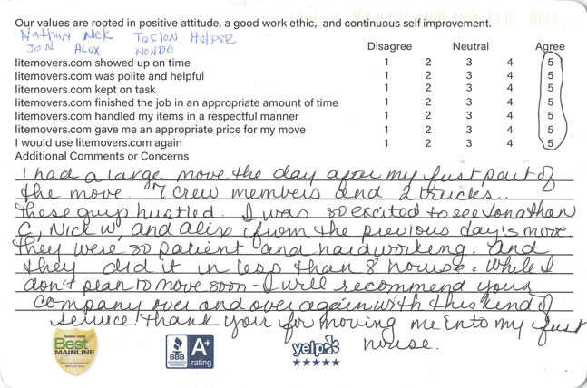 “I had a large move the day after my first part of the move — 7 crew members and 2 trucks. These guys hustled. I was so excited to see Jonathan, Nick, and Alex from the previous day’s move. They were so patient and hardworking, and they did it in less than 8 hours. While I don’t plan to move again soon, I will recommend your company over and over again with this kind of service! Thank you for moving me into my first house!”