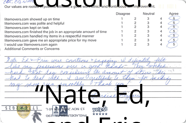 A Smooth Move in King of Prussia, PA We’re happy to share this kind review from a recent customer: “Nate, Ed, and Eric were courteous and engaging. I definitely felt like my possessions were in good hands.December 26, 20252 Easy ways to get a FREE ESTIMATE Click below and fill out the move detail formFREE ESTIMATE Or just give us a call today at 610-755-5535