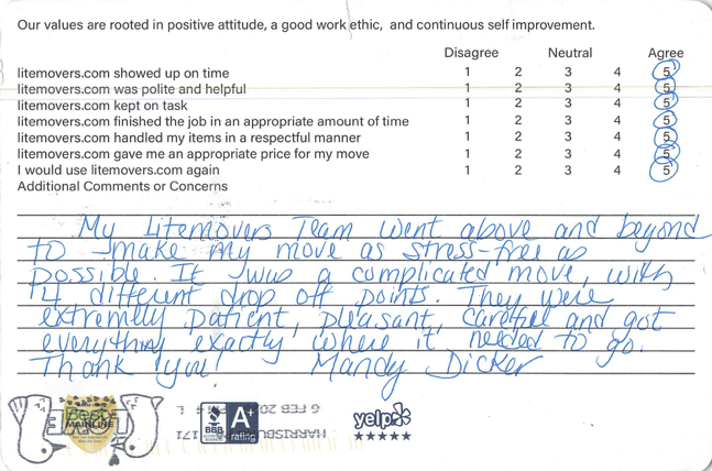 “My Litemover team went above and beyond to make my move as stress-free as possible. It was a complicated move, with four different drop-off points. They were extremely patient, pleasant, careful, and got everything exactly where it needed to go. Thank you!”