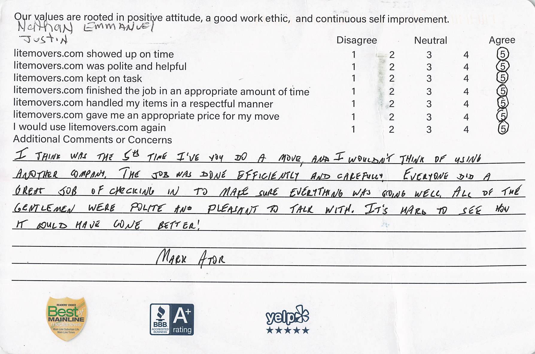 “I think this was the fifth time I’ve had LiteMovers complete a move. I wouldn’t think of using another company. The job was done efficiently and carefully. Everyone did a great job of checking in to make sure everything was going well. All of the gentlemen were polite and pleasant to talk with. It’s hard to see how it could have gone better!”