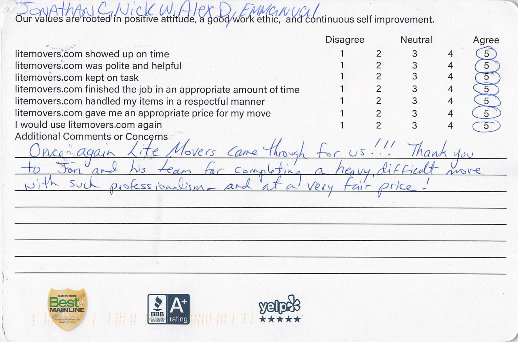 “Once again LiteMovers came through for us! Thank you to Jon and his team for completing a heavy, difficult move with such professionalism and at a very fair price!”