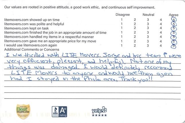 I was thrilled with LiteMovers Jorge and his team were very efficient pleasant and helpful Not one of my things were damaged I would definitely recommend LiteMovers to anyone and would hire them again had I stayed in the Philadelphia area Thank you