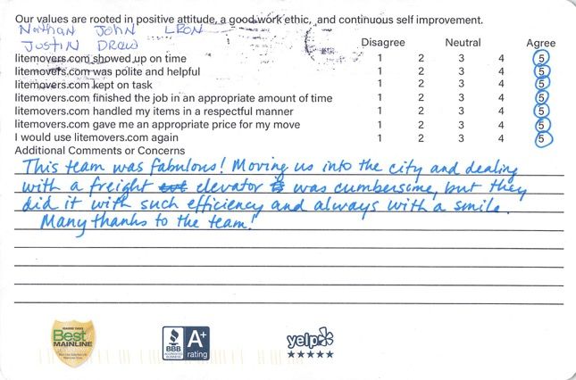 This team was fabulous Moving us into the city and dealing with a freight elevator was cumbersome but they did it with such efficiency and always with a smile Many thanks to the team