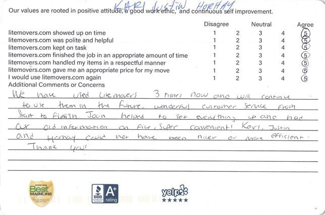 We have used Litemovers 3 times now and will continue to use them in the future Wonderful customer service from start to finish Joan helped to set everything up and had our information on file super convenient Karl Justin and Jorge could not have been nicer or more efficient Thank you