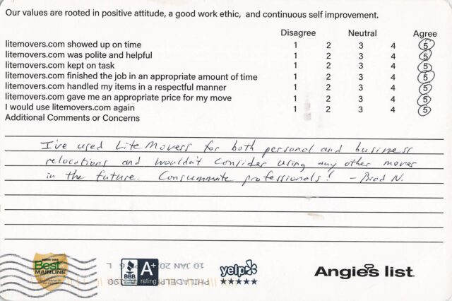 Ive used Litemovers for both personal and business relocations and wouldnt consider using any other movers in the future Consummate professionals