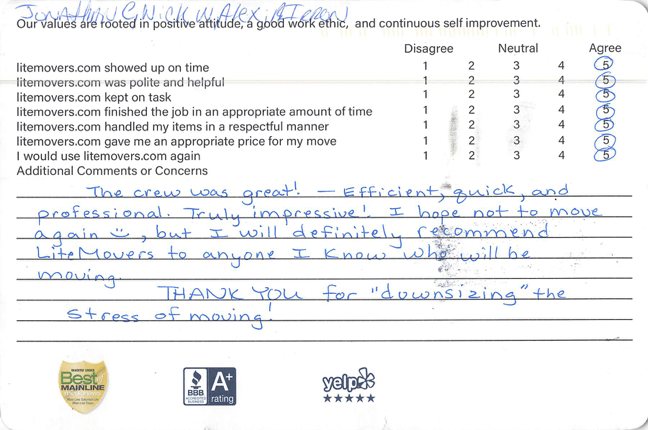 “The crew was great! Efficient, quick, and professional. Truly impressive! I hope not to move again, but I will definitely recommend LiteMovers to anyone I know who will be moving. Thank you for ‘downsizing’ the stress of moving!”