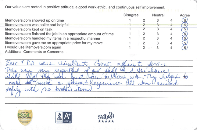 “Eric and Ed were excellent. Great, efficient service. They were very respectful of our belongings and the house itself. They hookup were also great fun to work with and helped make the move a pleasant experience. All items arrived safely with no broken items!”
