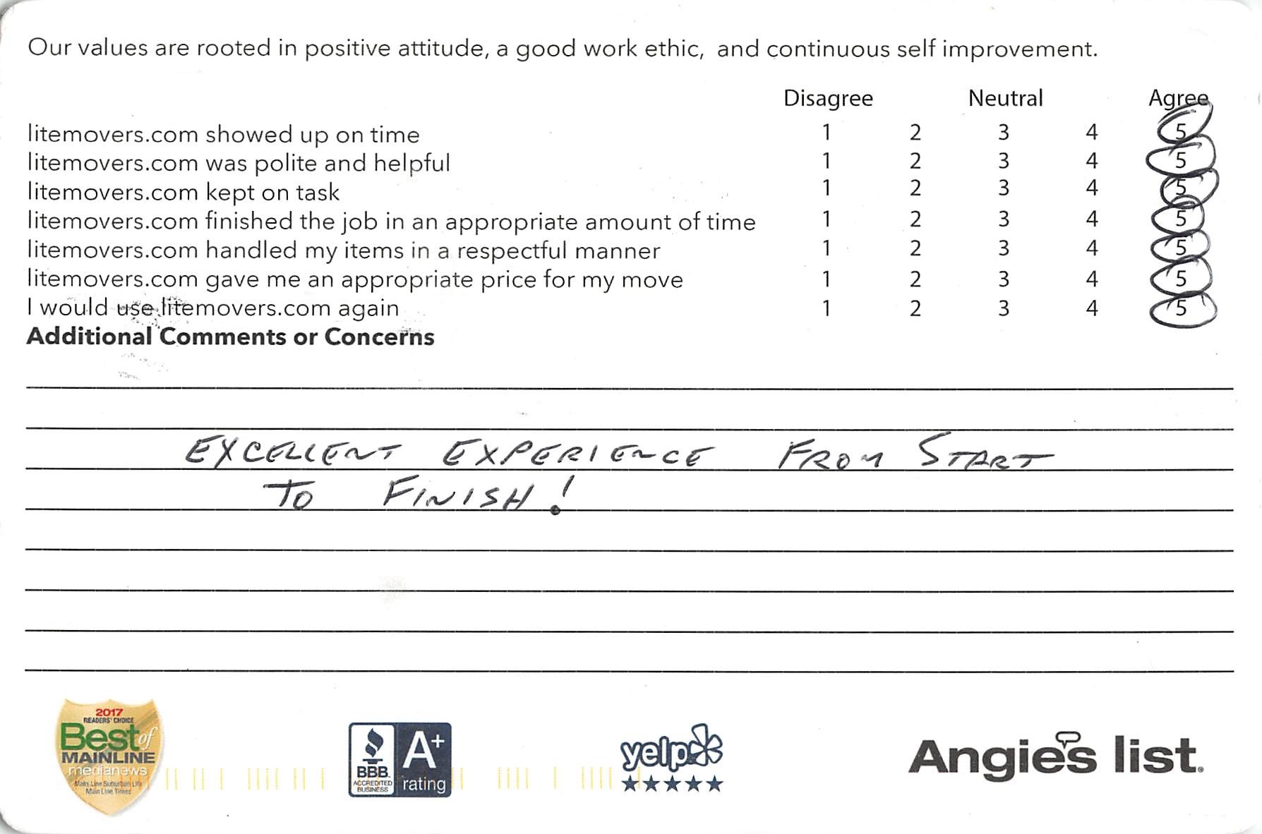 Excellent Moving ExperienceJuly 27, 2019Excellent Moving Experience from start to finish2 Easy ways to get a FREE ESTIMATE Click below and fill out the move detail formFREE ESTIMATE Or just give us a call today at 610-755-5535