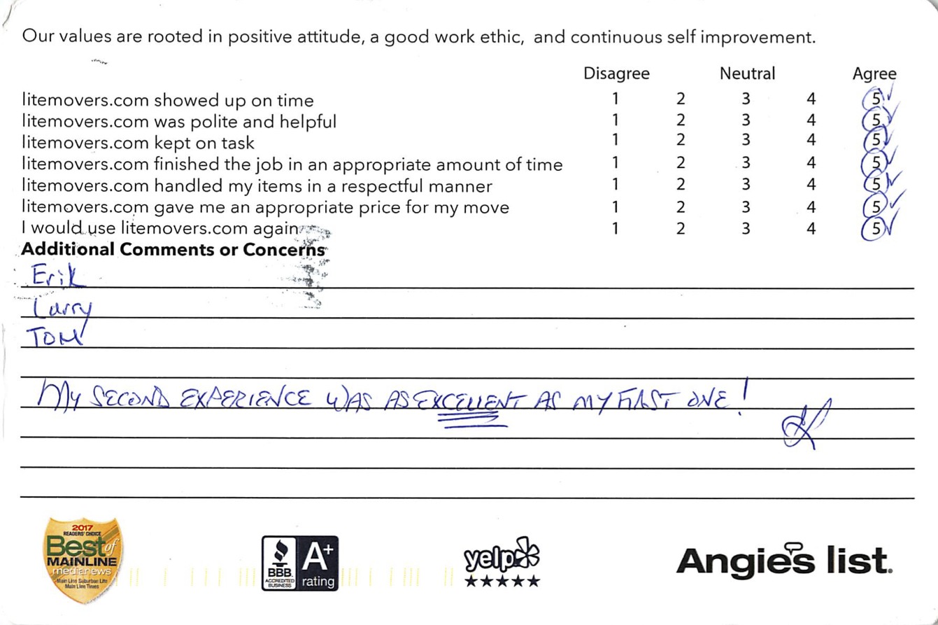 Second experience was as excellent as the first!July 5, 20182 Easy ways to get a FREE ESTIMATE Click below and fill out the move detail formFREE ESTIMATE Or just give us a call today at 610-755-5535