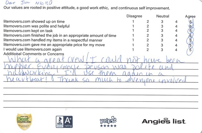 ”What a great crew! I could not have been happier. Every single person was polite and hardworking! I’d use them again in a heartbeat! Thanks so much to everyone involved!”
